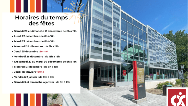Voici notre horaire pour le temps des Fêtes. Veuillez prendre note que nous serons fermés le jeudi 25 décembre 2025 ainsi que le 1er janvier